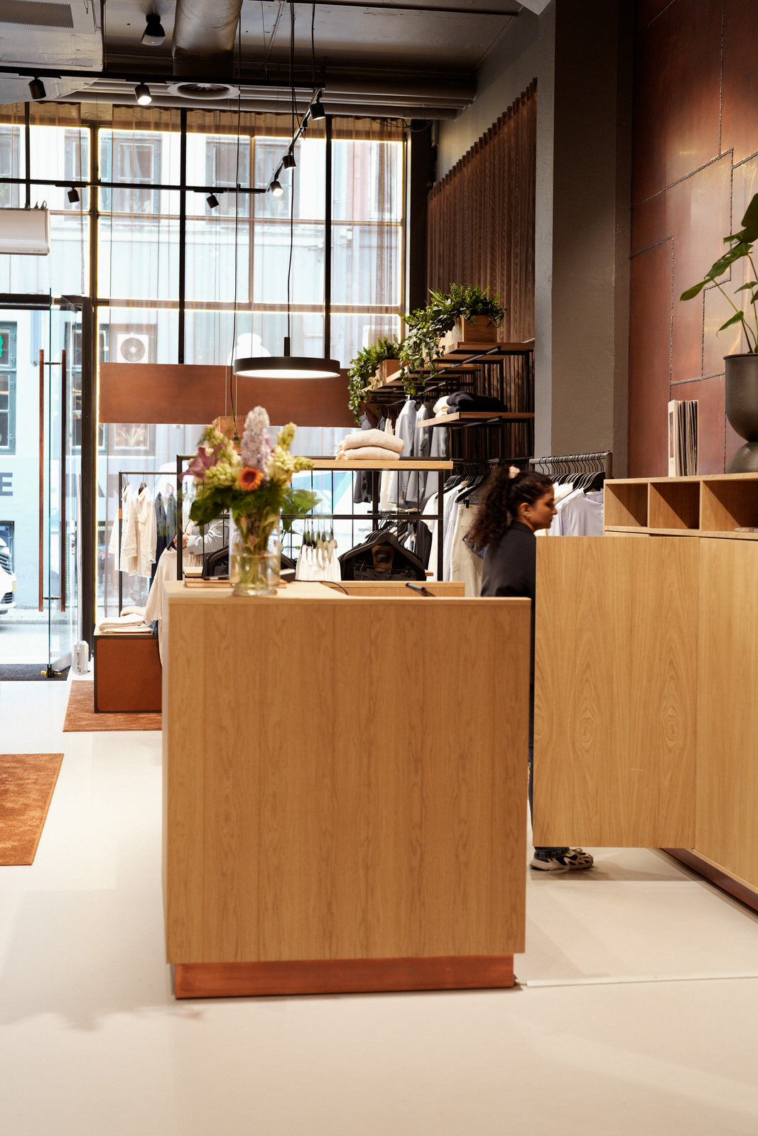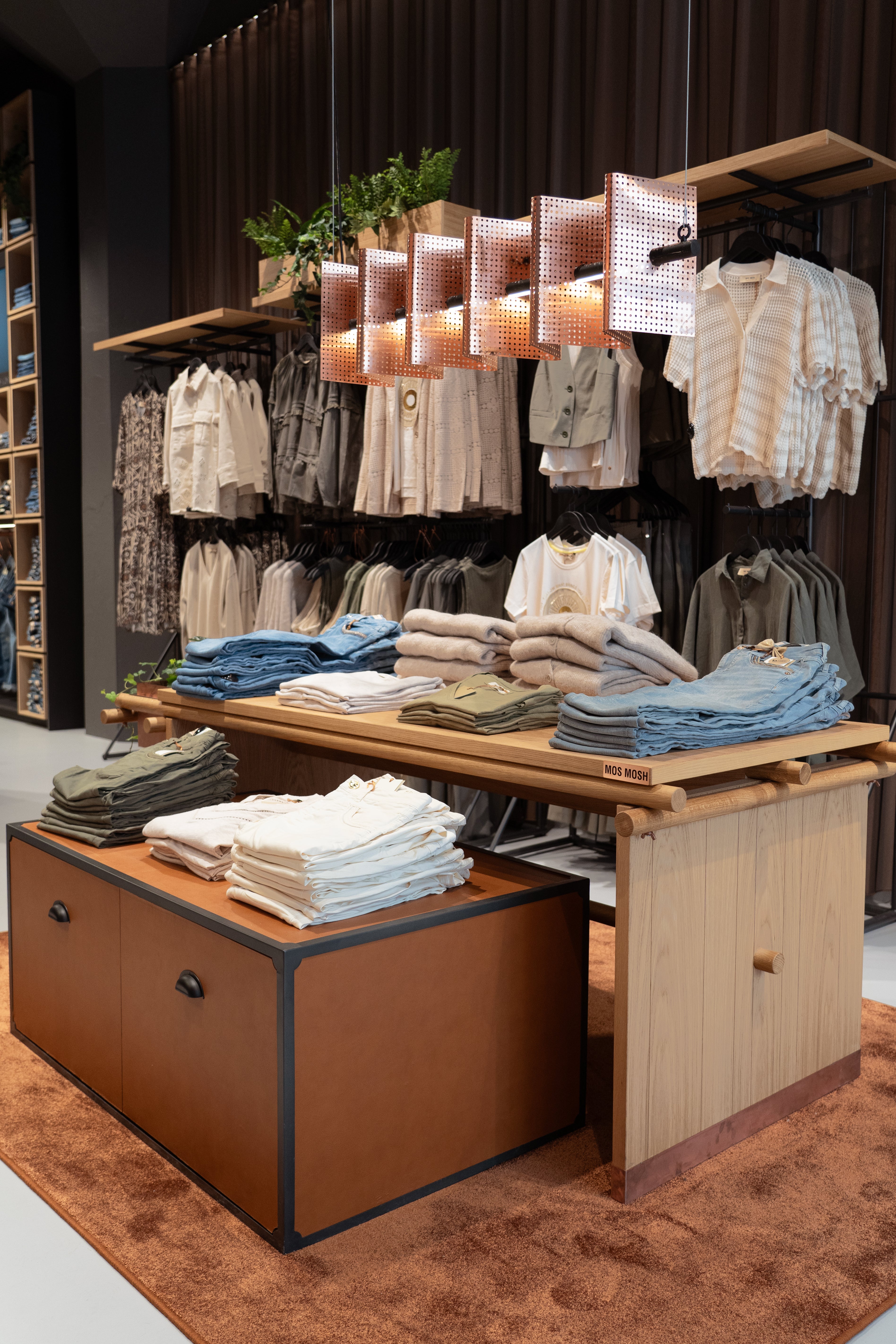 När du besöker vår MOS MOSH-butik i Köpenhamn får du uppleva mycket mer än mode. Inredningen är noggrant utvald och skapad utifrån enkla principer och eleganta material som läder, koppar, brunerat stål och gröna växter. Resultatet är en stämningsfull butik där mysighet och estetik går hand i hand.